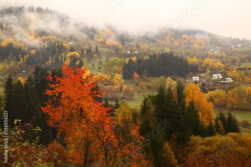 autumn, landscape, forest, nature, fall, tree, mountain, sky, mountain, tree, season, yellow, colours, colourful, foliage, green, fog, view, wood, outdoors, beautiful, red, leaf, park
