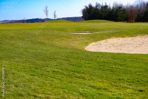 Hilly landscape. Green grass on the hills among the trees in early spring. Beautiful landscape in early springtime