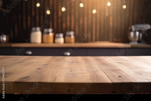 Hintergrund Holztisch mit unscharfen bokeh Lichtern. Copyspace, Banner, Generative AI