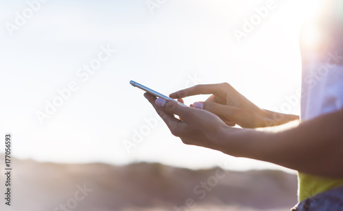 Hipster girl hold on smart phone gadget in sand coastline, mock up blank screen. Traveler using in female hand mobile on background beach seascape horizon. Tourist look on blue sun summer lifestyle