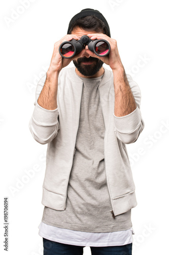 Hipster man with binoculars on white background