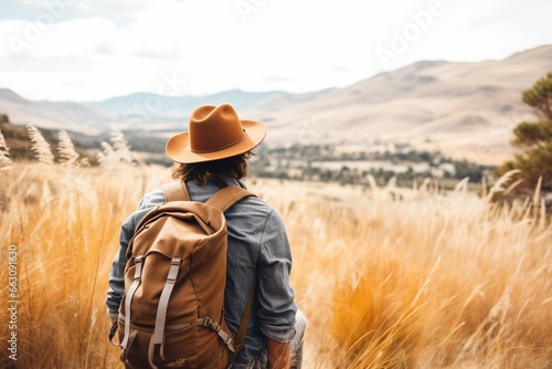 Hipster traveler with backpack sitting on top of a mountain and looking at the valley.