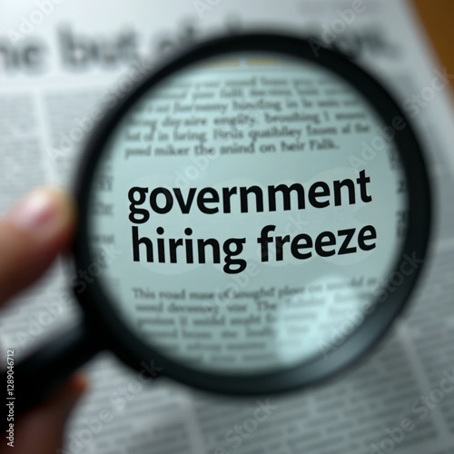 government, hiring, freeze, news, newspaper, economy, policy, job, employment, unemployment, budget, crisis, recession, finance, politic, administration, search, magnifying glass, magnifier, sharpened, detail, text, information, analysis, research, media, press, article, headline, announcement, impact, social issue, problem, challenge, scrutiny, investigation