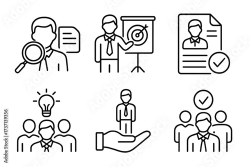 hiring, recruitment, job, work, career, business, icon, set, symbol, vector, human, resource, hr, candidate, employee, resume, interview, training, manager, employment, search, selection, approved, team, personnel, corporate, staff, agency, headhunting, goal, target, support, presentation, idea, outline, line, graphic, illustration, pictogram, signs, simple, modern, web, app, infographic