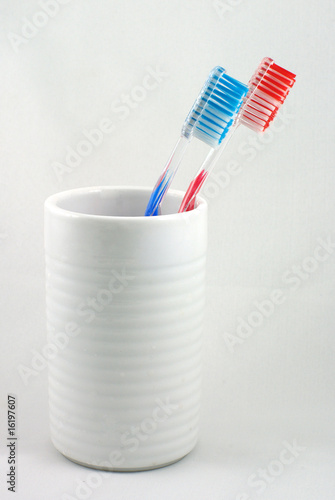 teeth, brush, brush, clean, cleaning, teeth, red, blue, his, hers, couple, living, together, sharing, bathroom, dental, hygiene, dentist, plaque, fight, prevent, filling, decay, twice, daily, white, background