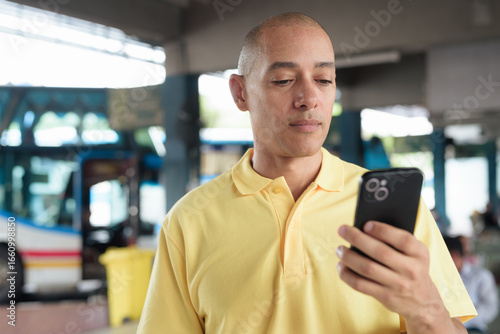 man, bus, station, travel, passenger, transport, businessman, business, hispanic, latino, italian, 40s, adult, middle-aged, bald, balding, alopecia, male, portrait, attractive, photogenic, mature, person, people, authentic, human, casual attire, yellow, standing, commuting, waiting, sitting, journey, holiday maker, siam, using, phone, cyberspace, technology, smartphone, texting, browsing, reading, face