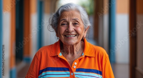 hispanic, elderly, woman, happy, wearing, orange, cardigan, looking, camera, senior, old, smiling, people, mature, person, smile, face, grandmother, retired, hair, lady, retirement, 1, happiness, age, older, lifestyle, beauty, aged