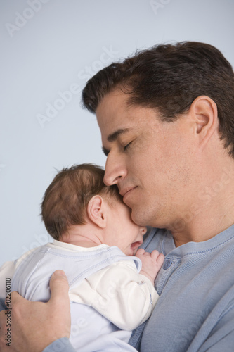 baby boy, blue, bonding, caring, childhood, closeup, color image, colored background, comforting, concern, cuddling, cut-out, devotion, eyes closed, family, father, fatigue, helpless, holding, innocence, love, man, napping, newborn, parenting, people, photo, profile, responsibility, sentiment, half face, sleeping, son, studio shot, supporting, together, two people, vertical, vulnerability