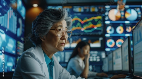 Hispanic female senior data scientist analyzing risk management reports on a large digital screen in a monitoring room, with diverse consulting team working at desktop computers behind her.