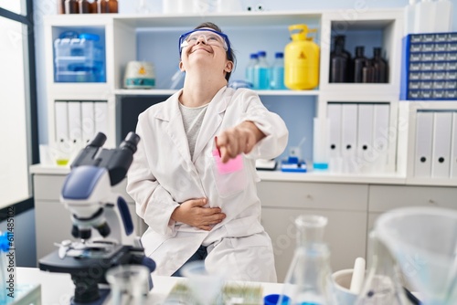 Hispanic girl with down syndrome working at scientist laboratory laughing at you, pointing finger to the camera with hand over body, shame expression