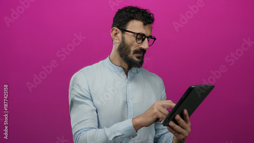 man, hispanic, beard, tablet, pink, background, technology, enthusiastic, thumb, gesture, smiling, happy, digital, device, screen, modern, communication, expression, positive, casual attire, interactive, portrait, smart, fashion, goggles, wearing, shirt, profile, sharpened, engagement, adult, photogenic, male, attractive, confidence, stylish, confident, lifestyle, attitude, pose, direction, head shot, bright, vibrant, isolated, studio, individual, person, young