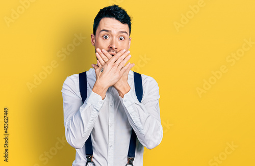 Hispanic man with beard wearing hipster look with bow tie and suspenders shocked covering mouth with hands for mistake. secret concept.