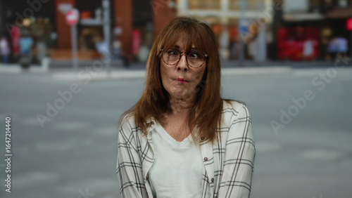 Hispanic senior woman smiling playfully on a busy city street with blurred buses in the background, wearing a plaid shirt and glasses.