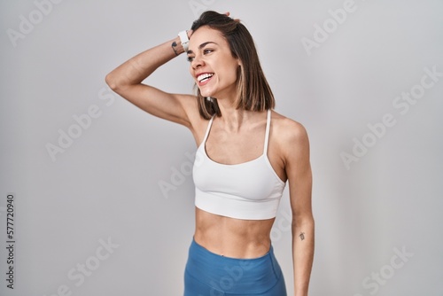 Hispanic woman wearing sportswear over isolated background smiling confident touching hair with hand up gesture, posing attractive and fashionable