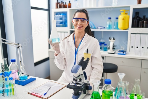 Hispanic woman working at scientist laboratory looking positive and happy standing and smiling with a confident smile showing teeth