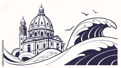 building, ocean, wave, architecture, landmark, sea, vignetting, blue, white, historic, city landscape, scenery, travel, coastal, water, storm, sky, church steeple, dome, landscape, illustration, art, historical building, design, sculpture, cultural, heritage, beautiful, nature, vintage, iconic, view, elegant, detailed, symbolic
