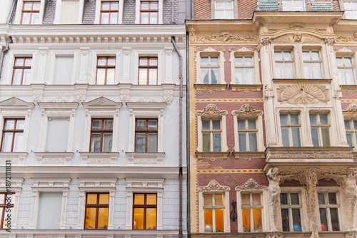 Historic classical architecture in Riga featuring richly decorated apartment house facades detailed window frames and preserved ornamental elements in urban streetscape