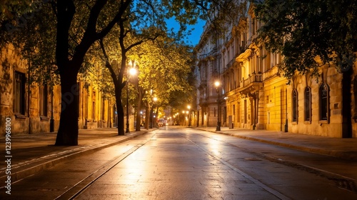 Historic European street illuminated at night. Ideal for urban tourism, architectural heritage, and romantic city concepts.