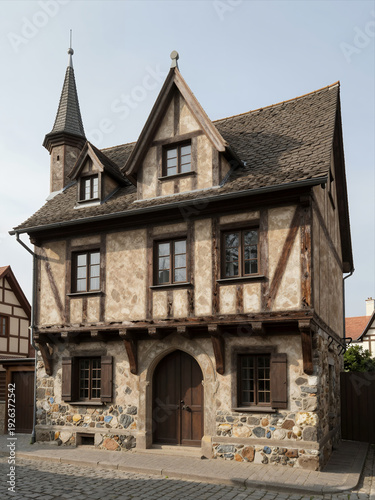 Historic Half-Timbered Stone House With Turret And Gabled Roof In Traditional European Architectural Style
