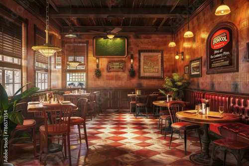 pizzeria, interior, vintage, decoration, warm, lighting, hospitality, dining, concept, eatery, marketing, design, showcase, red, leather, booth, wooden, table, chair, floor, chequered, poster, fan, ceiling, lamp, light, wall, art, decor, ambience, eatery, italian, cookery, menu, traditional, food, culture, historic, heritage, cosy, comfort, relax, welcoming, atmosphere, classic, elegant, style, history, nostalgia
