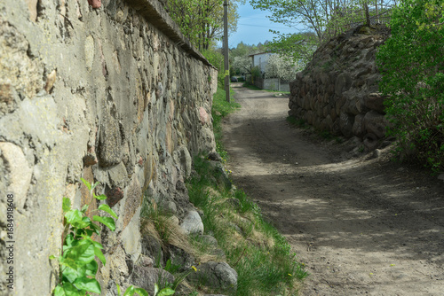 Historic village trail with stone masonry and forest shade perfect for travel themes architecture backgrounds and nature lifestyle concepts. Rustic pathway between ancient stone walls.