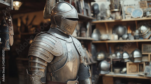 antique, vintage, armoring, historical, mediaeval, metal, craftsmanship, display, artifact, shop, decoration, cultural, heritage, collection, knight, interior, museum, object, design, artistry, shield, helmet, detail, tool, old-fashioned, tradition, rustic, silver, no people, still life, rich, artisanal, exploration, visual, nostalgia, background, aesthetic, history, timeless