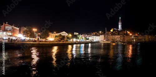 port, night, lighted, light, dark, evening, tour tourism, attraction, istria, croatia, sailboat, city, middle-ages, lighting, black, yellow, reflex, promenade, panorama, church, famous, sea, water, wave, peninsula, touristy