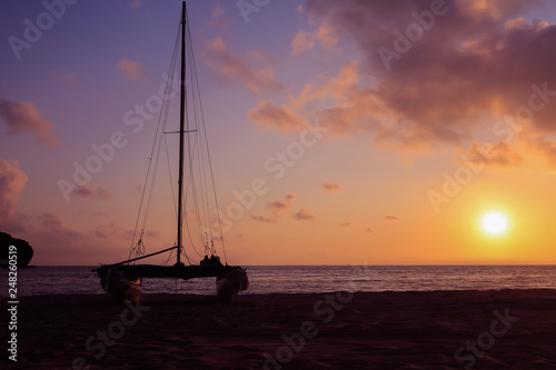 Hobie cat or catamaran on the beach at beautiful sunrise early morning