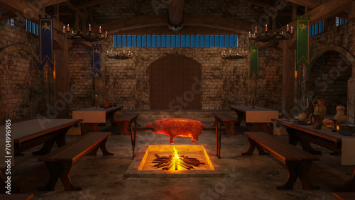 Hog roasting over an open fire in a medieval Viking dinner hall. 3D rendering..