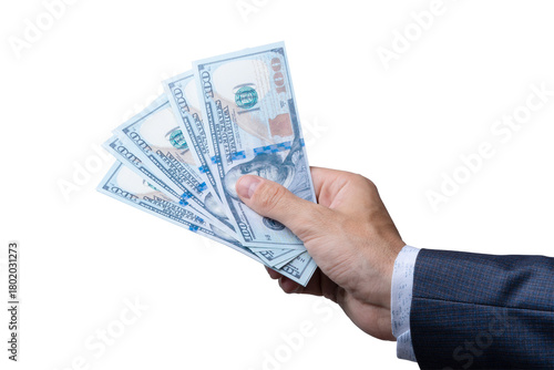 Holding five hundred dollar bills in one hand with a professional suit