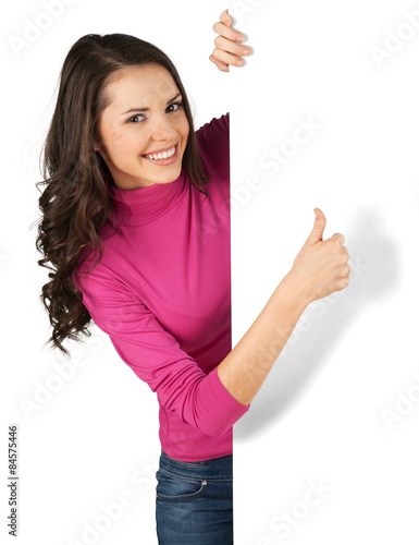 holding, little girl, peeking, banner, signs, woman, teenage, blank, people, white, billboard, isolated, paper, mischief, human hand, human face, showing, frame, emergence, female