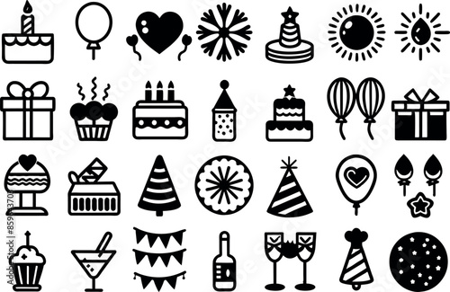 icon, vector, icon, set, symbol, illustration, silhouette, christmas, birthday, holiday, party, signs, cake, black, gift, tree, collection, winter, hat, food, design, celebration, decoration, travel, bag