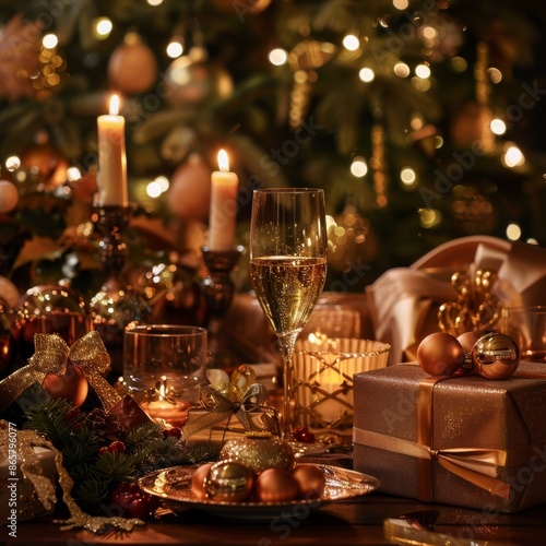 holiday, special, occasion, champaign, christmas, wine, glasses, celebration, drink, alcohol, new, decoration, party, year, gold, gift, beverage, new year, festive, goggles, celebrate, table, eve, christmas, anniversary, tree, candle