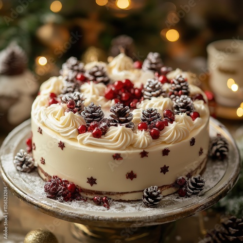 holiday, cake, festive, decoration, pine, cone, red, berry, cream, frosting, twinkling, light, dessert, celebration, winter, sweet, treat, epicure, baking, party, seasonal, table, culinary, art, homemade, delicious, joyous, occasion, sweet, display
