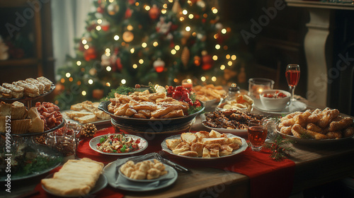 Holiday feast featuring various dishes and festive decorations by the Christmas tree