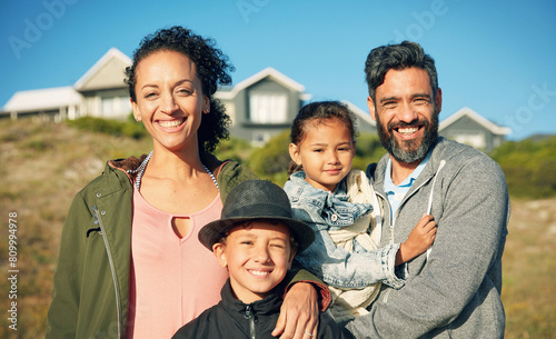 Holiday, house and outdoor portrait of family with smile, nature and bonding together on travel adventure. Mom, dad and children on summer vacation in backyard with blue sky, happy face and sunshine