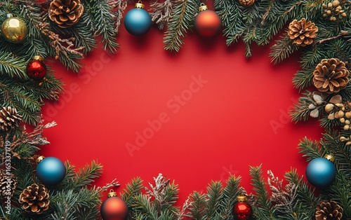 Holiday Wreath Arrangement With Pinecones and Ornaments on Red Background