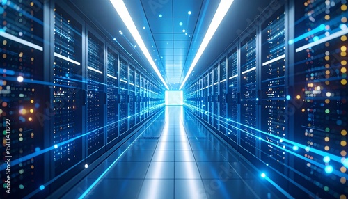 Holographic data streams flowing through futuristic server room with pulsing LED indicators and fiber optic cables networking
