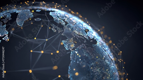 Holographic globe with network nodes, world connection, international business.