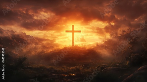 holy cross illuminated by a radiant light against a dramatic sky over golgotha hill, symbolizing the profound themes of hope and resurrection in a powerful and contemplative scene