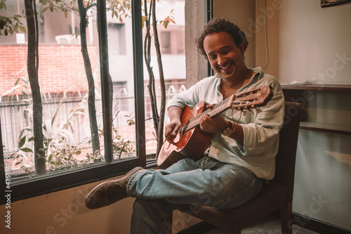Hombre tocando la guitarra felizmente