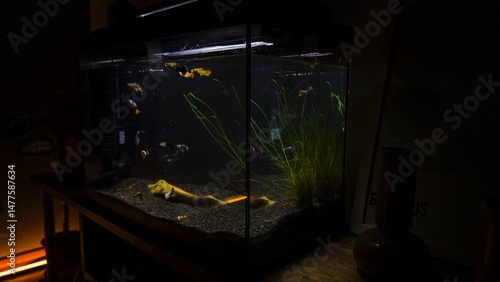 Home aquarium showcasing bright guppy fish and underwater vegetation, set in a warmly lit interior corner with wooden accents and decor.