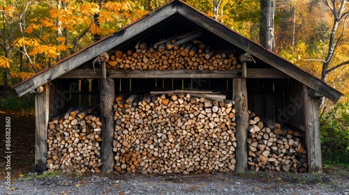 Home Comfort with Eco-Friendly Firewood: Rustic Wooden Shed Filled with Neatly Stacked Logs, Sustainable Heating for Winter, Ready-to-Use Wood Supply