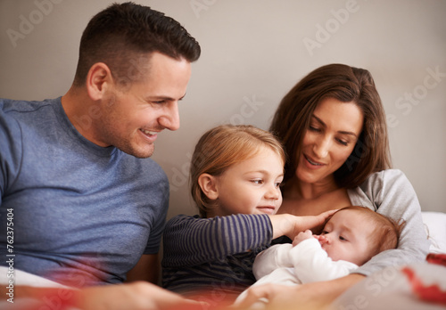 Home, family and parents with baby, kids and bonding together with happiness and care in the morning. Bedroom, mother and father with children and holding infant with comfort, smile and weekend break