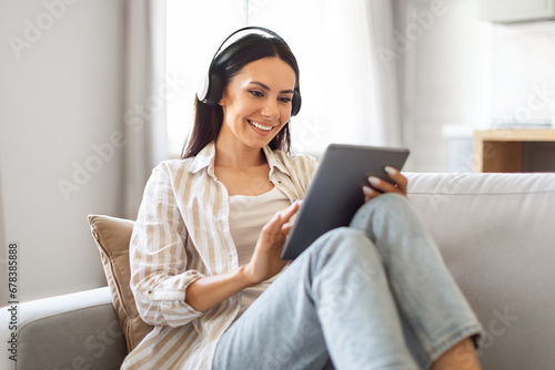 Home Pastime. Happy Woman Wearing Headphones Relaxing With Digital Tablet On Couch