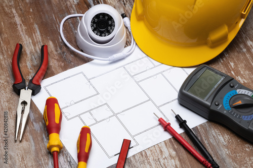 home, security, desk, concept, blueprint, cctv, network, installation, surveillance, plan, power, tool, system, technology, topview, light, innovation, cyberspace, application, automation, hard hat, helmet, conditioning, control, digital, electronic, element, energy, equipment, house, wireless, electricity, workplace