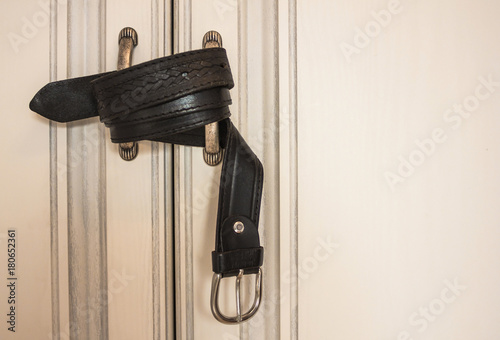 ban, taboo, penance, family, alarm, behind closed doors, belt, castigation, chastisement, correction, despot, discipline, embargo, fear, forcing, fright, house, intimidation, lanyard, whipped, leather, outrage, parenting, prohibition, punishment, sling, strap, terror, thong, tyrant, violence