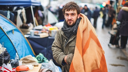 man, market, blanket, tent, homeless, poor, young, winter, bearded, casual attire, coat, foulard, crowd, shopping, fair, bazaar, warm, cosy, street, trade, seller, orange, activity, urban, scene, public, day, local, clothing, people, stall, merchandise, social, community, commerce, lifestyle, seasonal, event, hand-made, artisanal, rustic, browsing, vibrant, gathering, bustling, bustle, multicultural, diverse