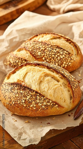 Homemade artisan bread with seeds rustic kitchen food warm tones close-up culinary artistry
