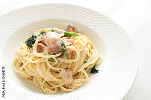 spaghetti, pasta, noodle, italian food, bacon, meat, pork meat, spinach, vegetable, green vegetable, creamy, homemade, lunch, plate, nobody, indoor, white background, copy space, still life